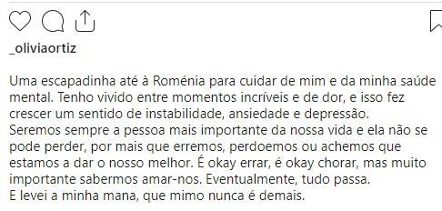 Olívia Ortiz não está a viver um mar de rosas, como acabou por confessar numa publicação que fez na sua página de Instagram esta quarta-feira, dia 29 de março.