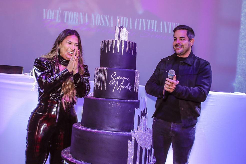 Simone Mendes não segurou às lágrimas e se emocionou com a homenagem da família em sua festa de 39 anos, nesta quarta-feira, 24/5, em São Paulo. A aniversariante apostou em um macacão preto, de vinil, com decote e justinho para curtir o seu dia.