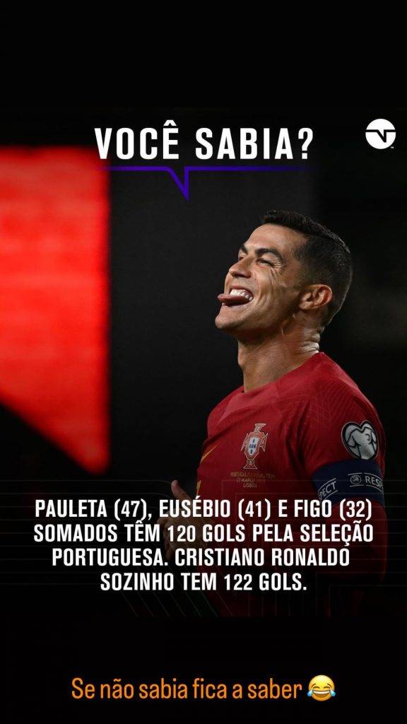"Você sabia? Pauleta (47), Eusébio (41) e Figo (32). Somados têm 120 golos pela seleção portuguesa. Cristiano Ronaldo sozinho tem 122 golos", escreveu.