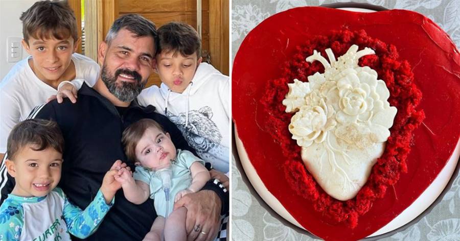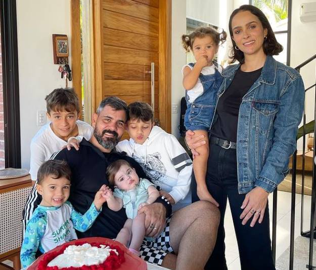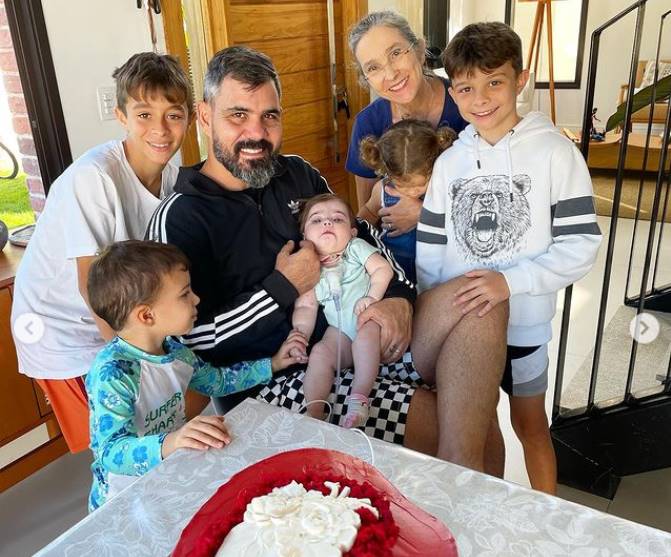 Em casa, no Rio de Janeiro, os papais reuniram os outros quatro filhos - Vicente, Inácio, Gaspar e Maria Madalena - e a avó materna das crianças, Elizabeth Moreira, para a festinha de mêsversário da caçula: a menina ganhou um bolo de aniversário decorado com um coração, em referência à dura luta que ela trava contra uma cardiopatia congênita raríssima desde que nasceu.