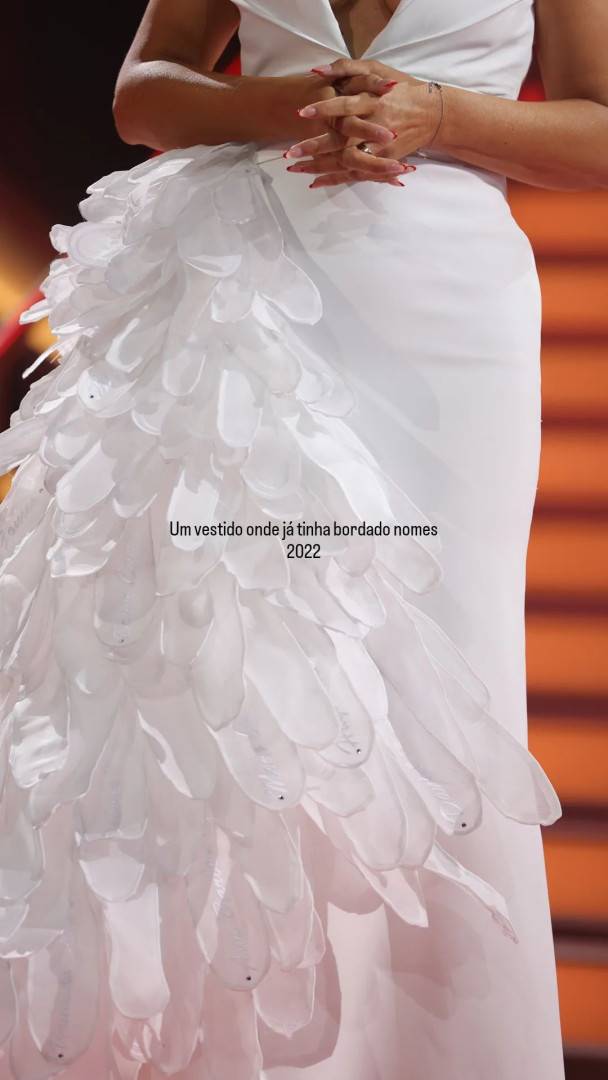"Um vestido onde já tinha bordado nomes. 2022", lembrou ao mostrar uma peça usada numa gala do 'Big Brother', em 2022, com a qual homenageou grandes nomes dos reality shows.