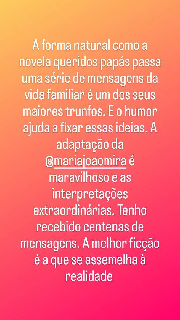 "A forma natural como a novela 'Queridos Papás' passa uma série de mensagens da vida familiar é um dos seus maiores trunfos. E o humor ajuda a fixar essas ideias", começou por escrever Cristina.