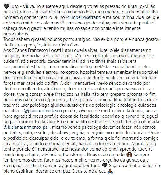 A atriz e rainha de bateria da , Quitéria Chagas, 42 anos, usou o Instagram para comunicar a de seu marido, o empresário italiano Francesco Locati, aos 57 anos, nesta sexta-feira (24). Ele estava em Milão, na , em tratamento contra um. No post, a atriz publicou uma foto e desabafou sobre o momento.