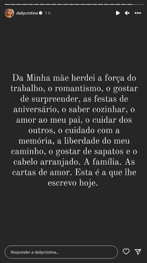Cristina Ferreira começou por escrever: “Da minha mãe herdei a força do trabalho, o romantismo, o gostar de surpreender, as festas de aniversário, o saber cozinhar, o amor ao meu pai, o cuidar dos outros”.