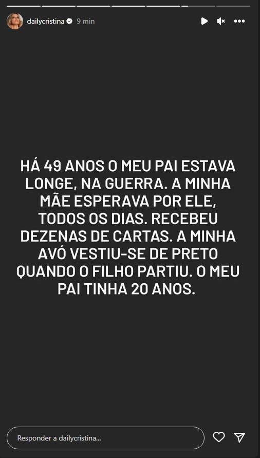 A apresentadora da TVI recordou a ida do pai para a guerra: “Há 49 anos o meu pai estava longe, na guerra. A minha mãe esperava por ele, todos os dias. Recebeu dezenas de cartas. A minha avó vestiu-se de preto quando o filho partiu”.