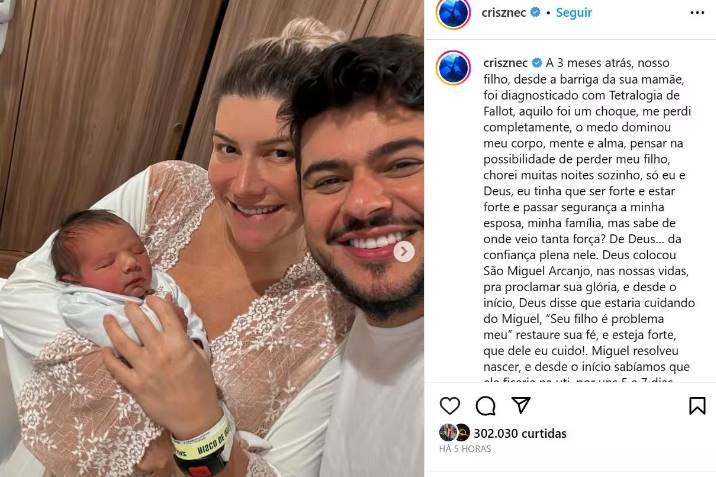 Na tarde deste sábado (03), o cantor Cristiano revelou que o pequeno Miguel precisará passar por uma cirurgia no coração devido ao diagnóstico de Tetralogia de Fallout - doença congênita que causa malformações no músculo cardíaco, aorta e valva pulmonar.
