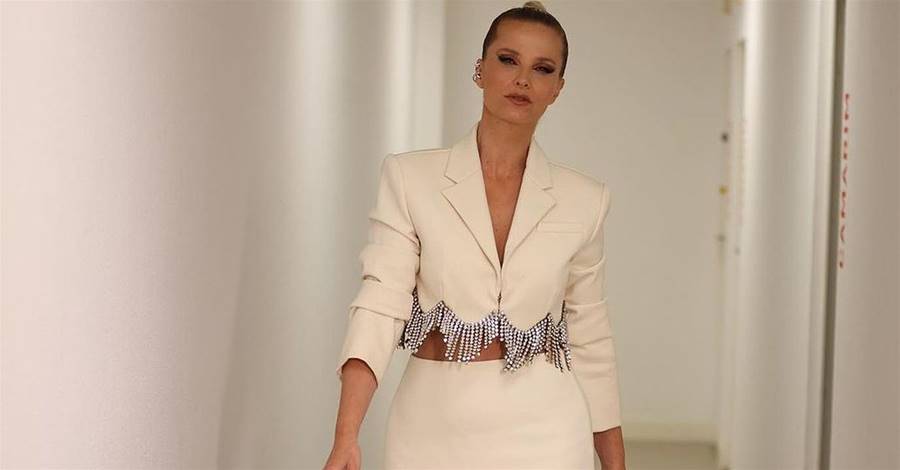 Em vez disso, o look que elegeu é mais simples e discreto, sendo composto por um blazer cropped e uma saia a condizer, da marca Area, fundada pelos designers Piotrek Panszczyk e Beckett Fogg.