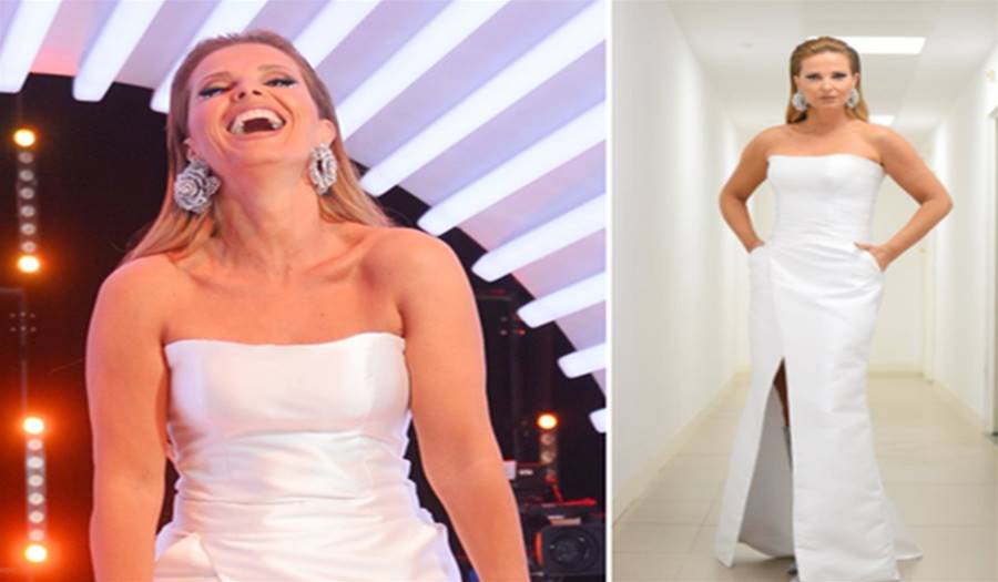 O vestido branco sóbrio realçou a elegância da apresentadora e foi acentuado por botas cheias de brilho incríveis e por um par de brincos lindos de morrer.