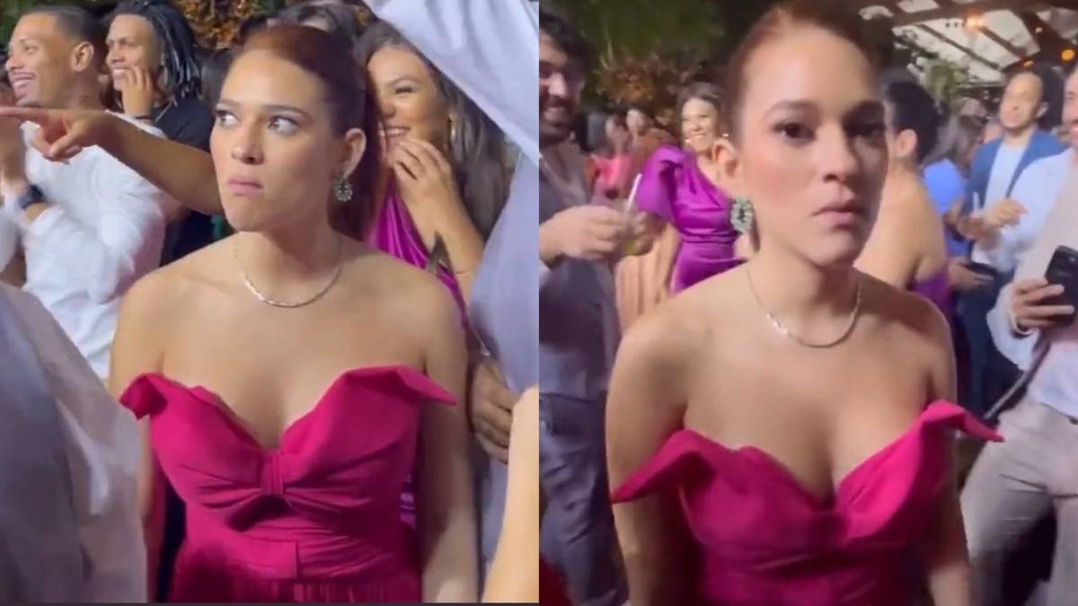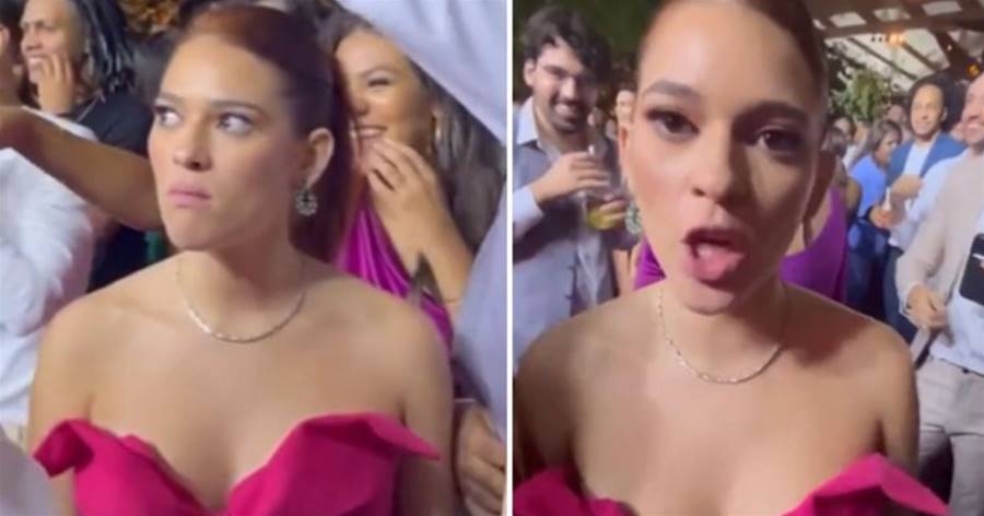 Porém, ela não foi a sortuda a pegar o arranjo, e sim um dos convidados da ex-BBB. Irritada, a comunicadora do Multishow aparece saindo do amontoado de pessoas xingando baixinho e fazendo caras e bocas por perder a chance.