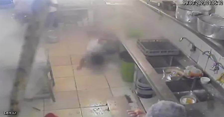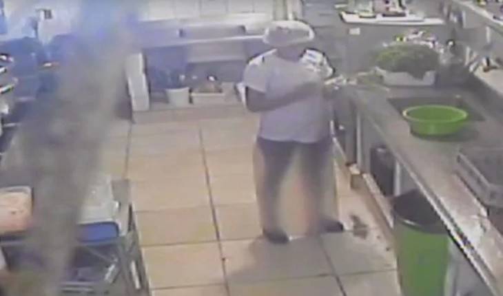 Almenda e outros dois funcionários podem ser vistos na cozinha do restaurante no momento do incidente. Ela mexia em seu celular em frente a um fogão industrial na sala e foi atingida diretamente pela panela após a explosão.